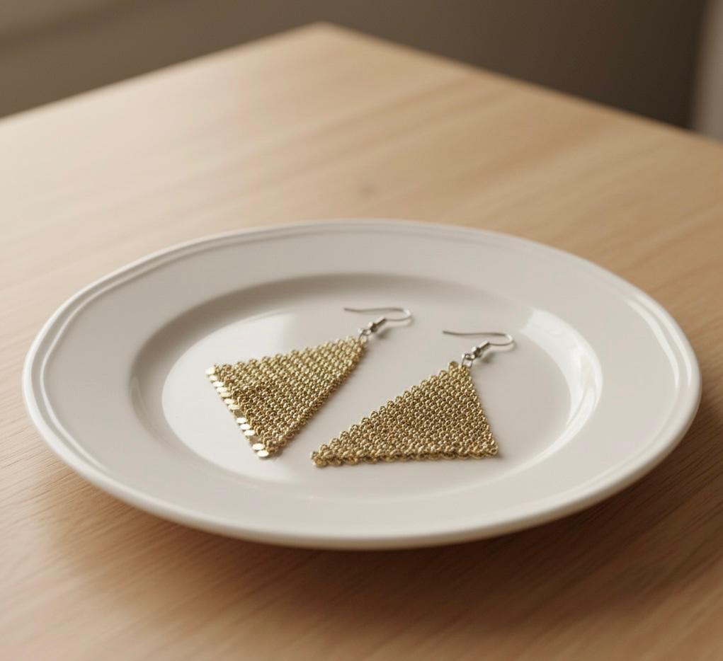 - Statement golden mesh dangle earrings with a bold, modern look