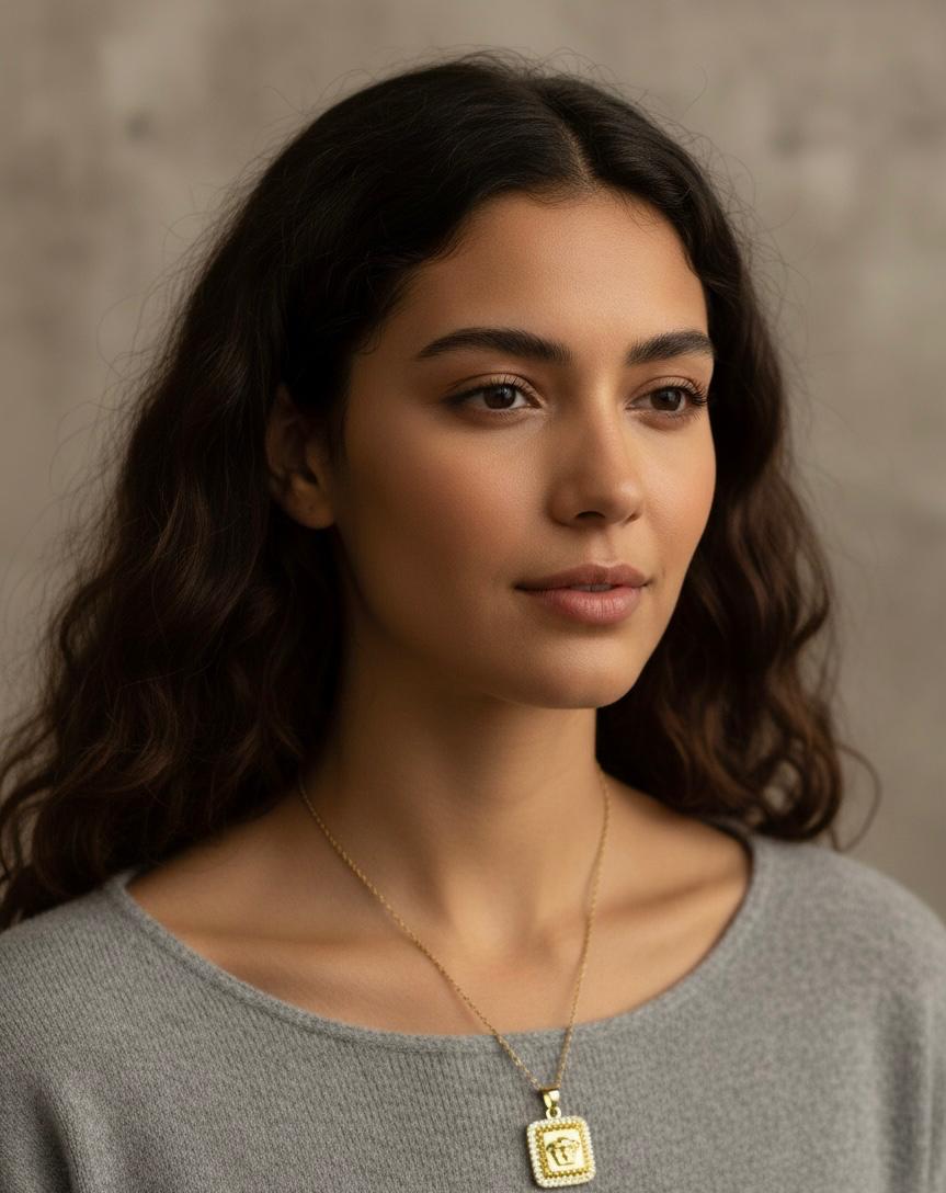 - Gold square pendant with a detailed Medusa face.