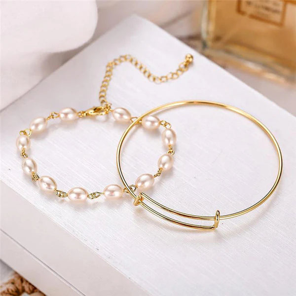 Elevate your elegance with this timeless bracelet duo. This set features two beautifully designed pieces – one sleek gold-toned classic bangle and one delicate bracelet adorned with lustrous pearls. The refined combination of modern minimalism and traditional charm makes it perfect for both everyday wear and special occasions.