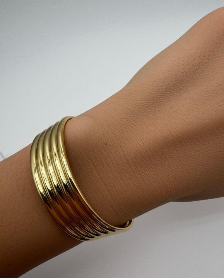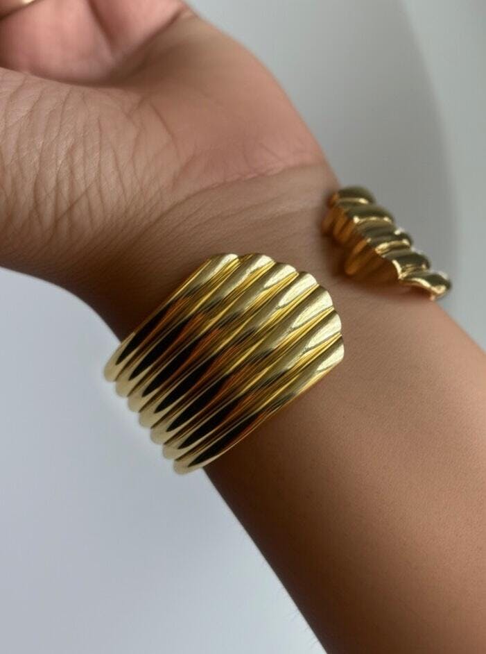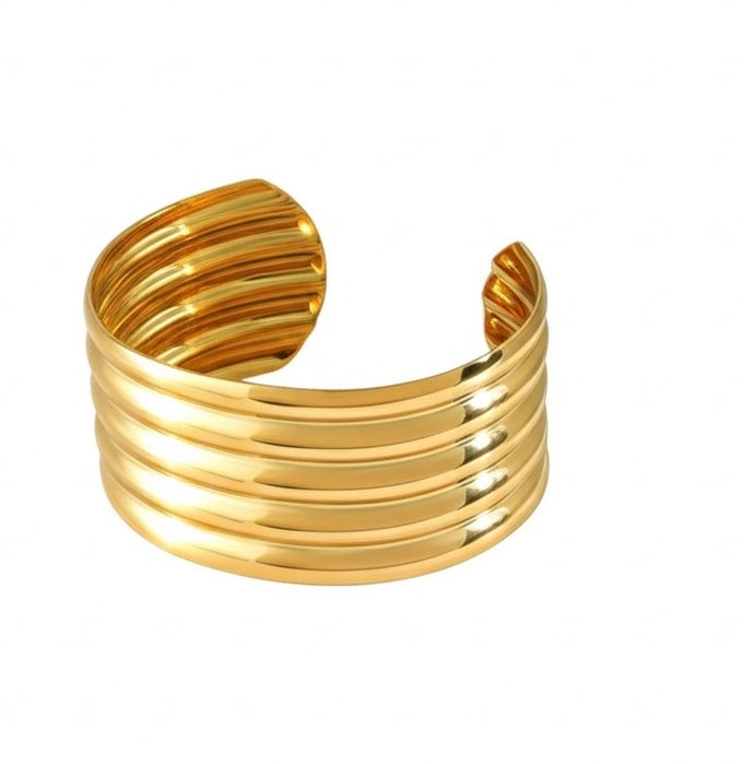 The 18K Gold Plated Ribra Luxe Cuff Bracelet is a bold and sculptural accessory designed to make a lasting impression. Crafted from durable surgical stainless steel and finished in a radiant 18K gold tone, this piece features a striking ribbed texture with a wide, open cuff silhouette that hugs the wrist comfortably.